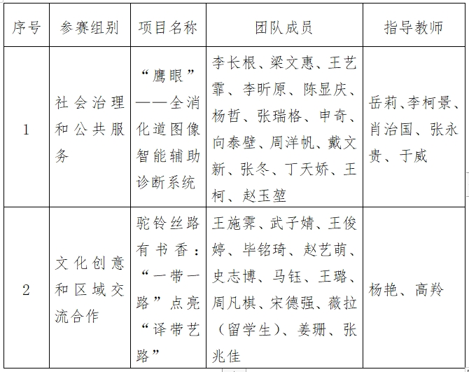 經校賽、省賽選拔,我校推報《“鷹眼”——全消化道圖像智能輔助診斷系統》、《駝鈴絲路有書香:“一帶一路”點亮“譯帶藝路”》2個項目參加國賽,具體信息公示如下: